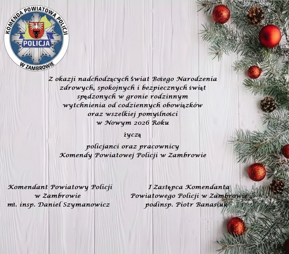 Z okazji nadchodzących Świąt Bożego Narodzenia Komendant Wojewódzki Policji w Białymstoku nadinspektor Kamil Borkowski wraz z zastępcami życzy radosnych, zdrowych i pogodnych Świąt Bożego Narodzenia spędzonych w ciepłej, rodzinnej atmosferze oraz wszelkiej pomyślności i zadowolenia na każdy dzień nadchodzącego 2026 roku.