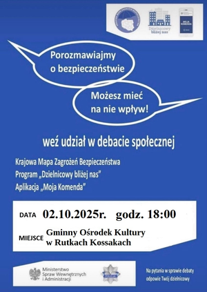 Dodano: 18.09.2025 "Porozmawiajmy o bezpieczeństwie - możesz mieć na nie wpływ" - zapraszamy mieszkańców gminy Rutki Kossaki na debatę -